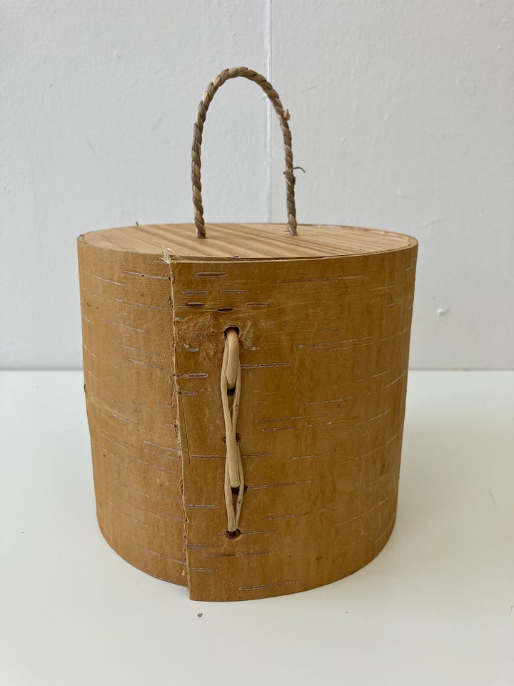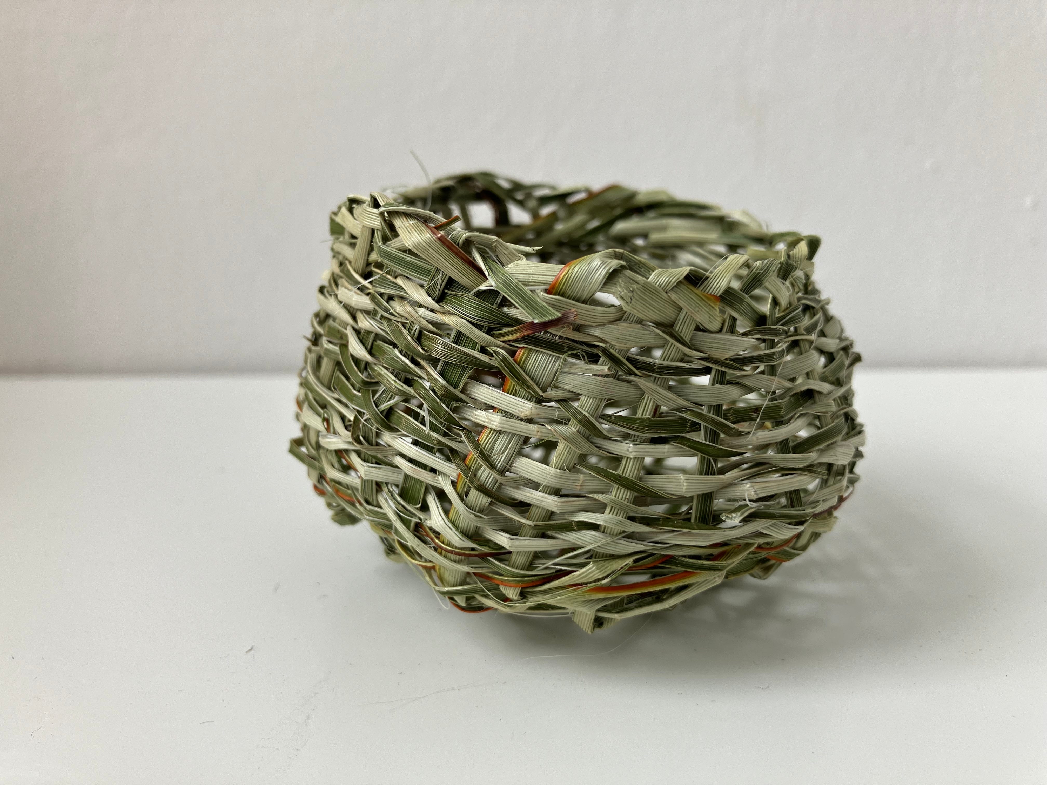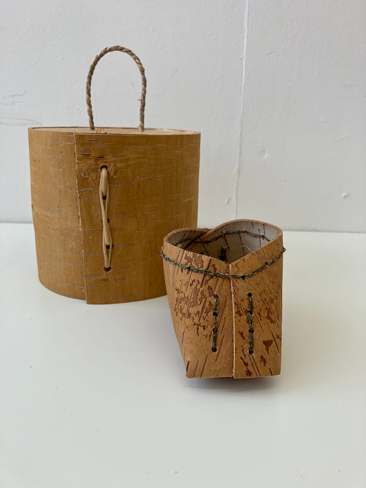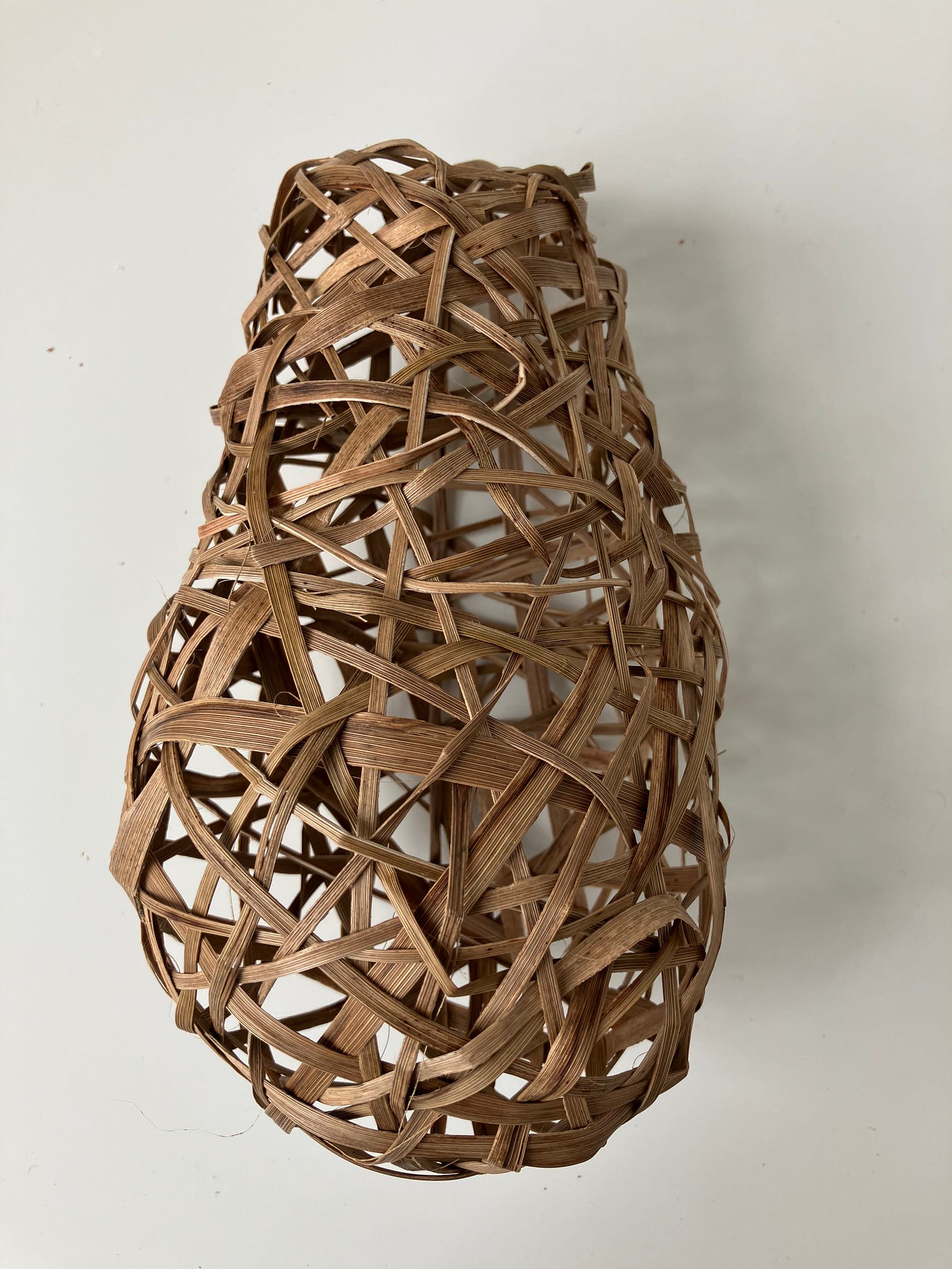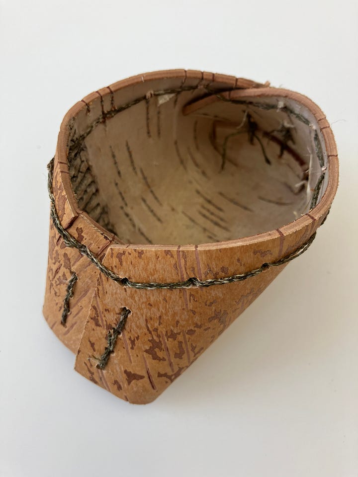 These materials start to fill my studio. Nettle. Willow. Birch Bark. Deer Skin. Fibres and sinews and bones. Their potential only just beginning to be unlocked. Seeking a way to learn, my yearning hands need shape and form. But I do not want to waste these more-than-human lives on forms without meaning. Reading Ursula K. Le Guin’s The Carrier Bag Theory of Fiction I find my answer. Le Guin writes of the hero narrative, the killer story, which has coopted all other narratives. This is the story upon which destructive anthropocentrism has been built. Proposing the need for a different story, ‘the life story’ (Le Guin 2019: 33), Le Guin suggests ‘the bottle as hero… bottle in its older sense of containers in general, a thing that holds something else… A leaf a gourd a shell a net a bag a sling a sack a bottle a pot a box a container. A holder. A recipient.’ (Le Guin 2019: 28-29) This is the form my hands need, the form through which I can begin to learn my new materials: the container. Perhaps humanities oldest object, it is the perfect encapsulation of the reciprocity that sits at the heart of The Honorable Harvest. This is where I will begin.