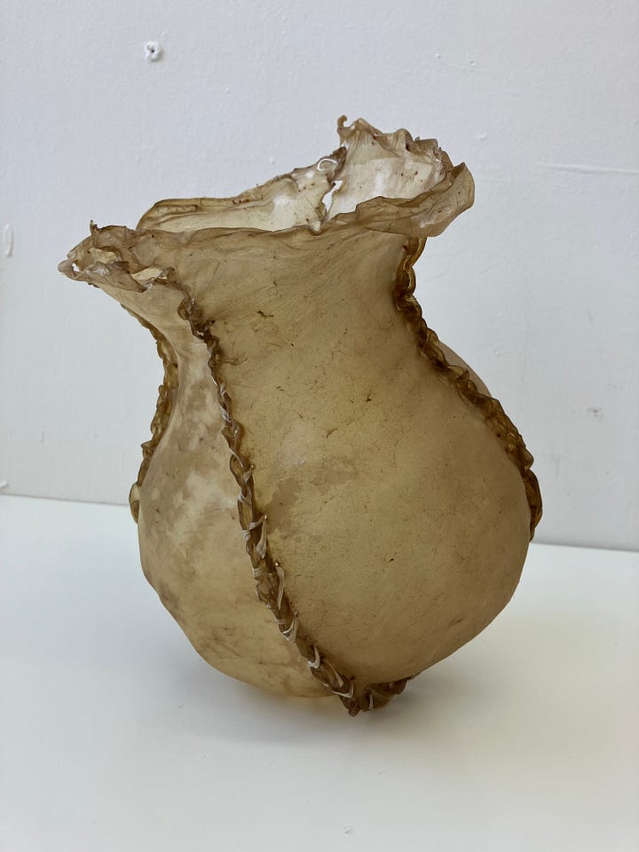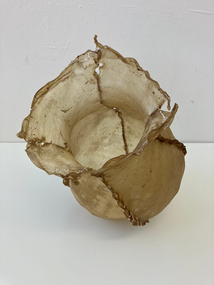 Working in the studio, I find myself drawing parallels between the container I am forming and the concept of the museum- a word whose presence in my research title is challenging and ripe with potential. Museums and galleries are vast containers, each filled with smaller containers - frames and plinths and glass fronted display cases. Since their early history museums have been instrumental in constructing and furthering the colonial, patriarchal narratives that have led to the earth crisis: the myth of civilisation, the killer story. However, as containers they also hold the potential for the other story, the life story.
